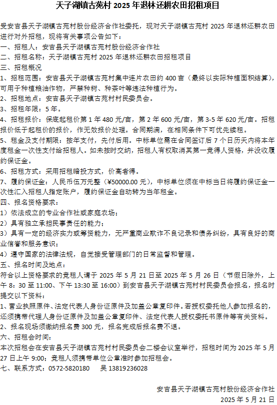 天子湖镇古苑村2025年退林还耕农田招租项目公告